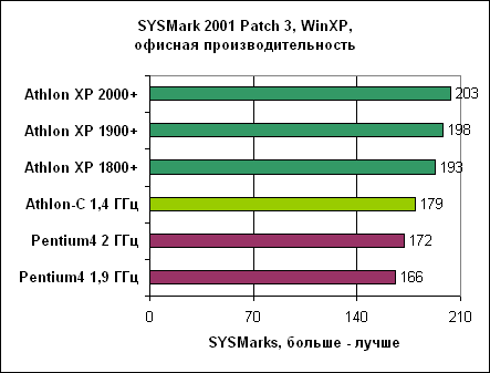 Athlon XP 2000+ занимает первое место в общем результате. Процессор на волосок находится от круглой цифры в 200 очков. В офисном же тестировании вся линейка Athlon обгоняет Pentium 4.