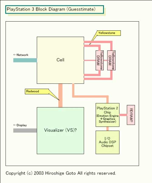 Прибыль, получаемая SCEI от PlayStation 2, составляет до 60% от общего дохода Sony (10% дохода компании, 3,59 мрд. долл. уходит на полупроводниковый бизнес ежегодно), так что компания старается из всех сил, чтобы консоль нового поколения получилась революционной. Судя по имеющейся информации, SCEI движется в правильном направлении. Судите сами: PlayStation 3 будет оснащена четырьмя чипами Cell с частотой 4,6 ГГц (пиковая производительность 32 SPE - 1 Терафлоп! И это не считая четырёх PPE и их блоков VMX!). Благодаря использованию четырёх процессоров пропускная способность подсистемы памяти составит 100 Гбайт/с. Правда, по имеющимся данным, объём XDR RAM составит "всего" 256 Мбайт, но будем надеяться, что компании, создающие игры, будут использовать эту память "с умом" (вспомним о 32 Мбайтах RAM, установленных в PlayStation 2, и о качестве игр для неё). Каждая консоль будет обладать портом интерфейса Flex I/O, благодаря чему подключать к ней аналогичные PlayStation 3 и другие устройства, оснащённые Cell, не составит особого труда.