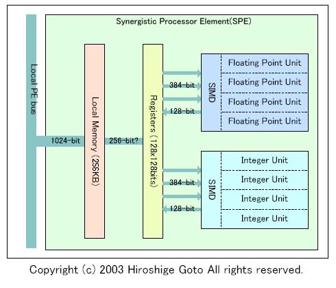 В результате всего вышеперечисленного можно сделать вывод, что SPE довольно похож на векторные блоки Emotion Engine: локальная память, четыре 32-битных векторных регистра, команды инициализации DMA и т.д. В принципе, в этом нет ничего особенного: Sony и Toshiba (которой, кстати, принадлежит большое количество патентов на векторные вычисления, полученные во время создания "медиапроцессоров" для цифровой техники в середине 90-х) работали над созданием Emotion Engine (равно как и Graphics Synthesizer), и часть архитектуры старого процессора легла в основу нового.