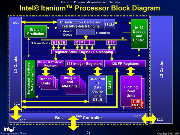 Вдобавок, сам по себе Itanium был в значительной степени пилотным проектом, как и Pentium Pro, так что процессор вообще стоит рассматривать больше как демонстрацию возможностей архитектуры, чем реальный коммерческий продукт. Характерный штрих - чипсет для Itanium, 460GX, поддерживает в качестве памяти всего лишь PC100 SDRAM, это кое-что говорит о скорости, с которой способен переваривать данные процессор. С другой стороны, однако, в какой-то мере не слишком быстрый интерфейс с оперативной памятью компенсируется очень большим кэшем - 2 или 4 Мбайт L3, работающими на полной частоте процессора (733 или 800 МГц), с пропускной способностью до 12.8 Гбайт/с.