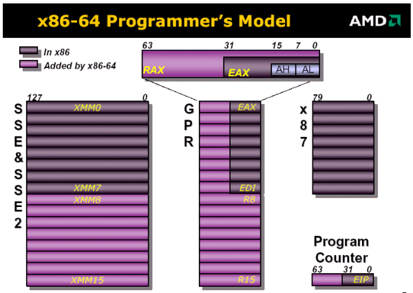 AMD предпочла более очевидный для компилятора путь, вдвое увеличив количество видимых ему регистров - в 64-бит режиме K8 имеет шестнадцать 64-бит регистров общего назначения. Количество регистров для операций с плавающей точкой осталось прежним - восемь, поскольку не на x87 при операциях с плавающей точкой здесь возлагается основная надежда, а на SIMD операции, потому и количество SIMD регистров также удвоено - тоже до шестнадцати.