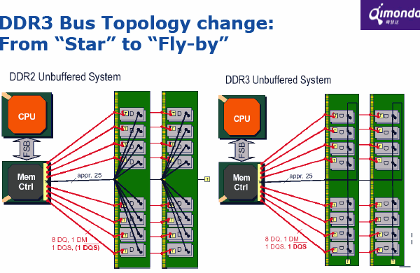 В своё время, при переходе от памяти DDR2 к DDR3 разработчиками нового по тем временам стандарта был сделан революционный шаг. Типичная для DDR2 топология подключения шины памяти "звёздочкой" была заменена на сетевую (Fly-by) топологию командной, адресной и управляющей шин, с внутримодульной (On-DIMM) терминацией и прецизионными внешними резисторами (ZQ resistors) в цепях калибровки.