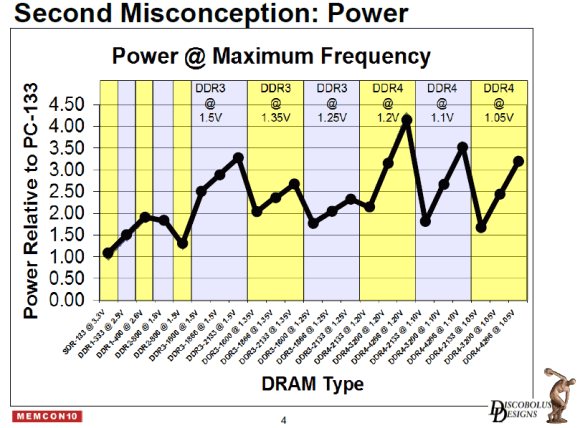 Однако растущая производительность – не единственный "козырь", продлевающий жизнь стандарта DDR3 и отдаляющий появление DDR4. Ещё один важный момент – энергопотребление, напрямую связанное с напряжением питания чипов памяти. Первоначально предполагалось, что напряжение питания новой памяти DDR4 составит 1,2 В, и затем появятся новые поколения чипов с питающим напряжением 1,1 В и 1,05 В. В то же время, для DDR3, впервые представленной в 1,5 В варианте, экспансия должна была закончиться на нынешних 1,35 В чипах. Однако выпуск низковольтной памяти DDR3 с напряжением питания всего 1,25 В делает появление 1,2 В памяти DDR4 преждевременным, так как более высокие частоты работы памяти значительно увеличивают энергопотребление.