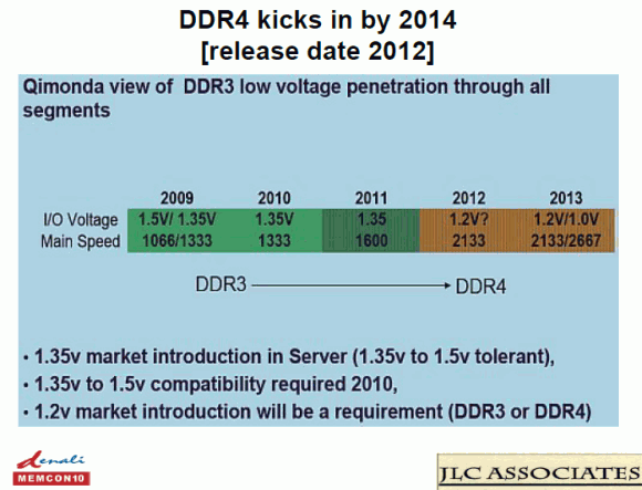 Отчасти переход на новый тип памяти тормозится технической неготовностью индустрии к выпуску DDR4. Например, чтобы выпускать чипы памяти DDR4 с напряжением питания хотя бы 1,2 В, необходимо сначала толком осилить 30-нм техпроцесс, а ведь в результате получится не самый экономичный чип даже по сравнению с нынешними 1,25 В вариантами DDR3 из-за более высокого энергопотребления на более высоких рабочих частотах. Меньшее напряжение питания транзисторных ядер, и, соответственно, меньшее энергопотребление чипов будут реальны только с освоением примерно 20-нм норм техпроцесса, что произойдёт не ранее 2012-2013 годов.