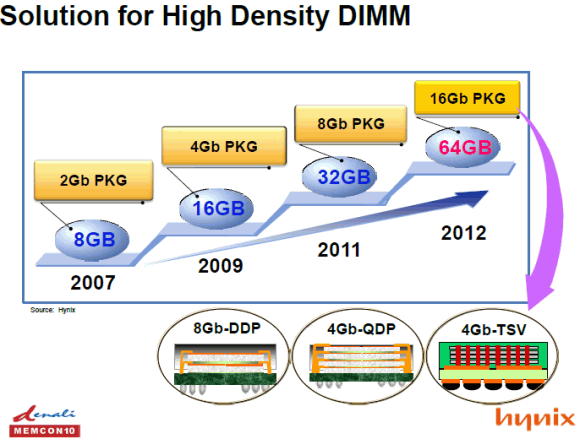 Над внедрением технологии TSV также активно работает компания Hynix, которая в рамках Denali MemCon10 рассказала о собственных планах выпуска ёмких чипов DDR и GDDR на ближайшие годы. По словам представителей компании, разработка методик применения TSV в настоящее время находится в зачаточном состоянии, и пока трудно оценить, какие плюсы это может принести в будущем.