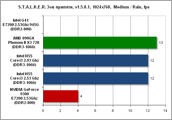 Вначале посмотрим на результаты синтетических тестов.         Результат SuperPI измеряется в секундах, т.е. меньше - это лучше.    Сжатие данных (WinRAR) измерялось в кб/с, т.е. больше - это лучше.                 ⇡#ВыводыЧто касается совместимости и качества драйверов, то мы обнаружили только три проблемы. В частности, система с процессором Intel Core i3 не смогла пройти игровой тест Dirt 2, а система на чипсете NVIDIA показала неприемлемо низкий уровень производительности в игре Far Cry 2. В остальных играх и приложениях графическое ядро Intel HD Graphics демонстрировало весьма четкую и хорошо прорисованную картинку без каких-либо артефактов. Это касается не только перечисленных приложений, но и массы других игр, которые не имеют встроенного бенчмарка и использовались исключительно для оценки качества 3D-изображения. Что касается скорости, то и тут графическое ядро HD Graphics показало себя с наилучшей стороны при сравнении с ядром NVIDIA GeForce 9300. Однако графика Intel имеет определенные архитектурные слабости, которые, впрочем, с лихвой компенсируются высокоскоростным процессорным ядром. Что касается платформы AMD, то она вполне объяснимо выиграла в большинстве тестов из-за сочетания последнего поколения графического ядра и довольно мощного процессора (к тому же недешевого - он на 500 руб. дороже Intel Core i3-530). Отметим, что в ассортименте Intel есть процессоры с интегрированной графикой помощнее чем Core i3-530, и разница в скорости платформ может быть куда меньше (или исчезнуть вовсе). Стоит отметить, что если бы существовала материнская плата на чипсете NVIDIA GeForce 9300 с поддержкой процессоров Intel Core i3, то производительность такой платформы была бы значительно выше связки Intel Core i3 + Intel H55. В пользу этого говорят два факта. Во-первых, производительность процессорного ядра Clarkdale заметно выше скорости ядра Wolfdale при работе на одной и той же частоте. Это можно увидеть как в синтетических тестах, так и в реальных приложениях. Во-вторых, с ростом скорости процессорного ядра Intel Core i3 общая производительность 3D-графики не увеличивается. В то же самое время, чипсет NVIDIA имеет значительный запас в плане масштабирования 3D-производительности в зависимости от скорости процессора. Впрочем, компания Intel не продлила лицензионное сотрудничество с NVIDIA (более того - заставила поделится технологией SLI), что делает появление новых чипсетов NVIDIA для платформы LGA1156 маловероятным событием. Соответственно, в ближайшем будущем основой для систем Intel с интегрированной графикой будут исключительно собственные чипсеты. Теперь коснемся вопроса стоимости процессоров Intel Core i3. Тут наблюдается некий парадокс - этот процессор является одновременно и дорогим, и дешевым. Для покупателя системы с материнской платой на чипсете Intel P55 и дискретной видеокартой этот процессор определенно дешев и позволяет сэкономить 3000-4000 руб. Это значительная сумма, которую можно потратить на более производительную видеокарту и в итоге получить более скоростную систему. Что касается покупателя офисной или домашней системы с интегрированной графикой, то данное семейство процессоров является очень дорогим и, к тому же, требует совсем недешевую материнскую плату на чипсете Intel H55. Поэтому, пожалуй, единственными пользователями, для которых оправдана покупка связки процессора Intel Core i3 и платы на чипсете H55, являются те, кто предъявляет высокие требовани