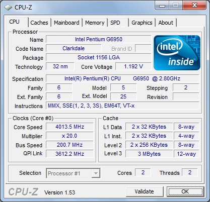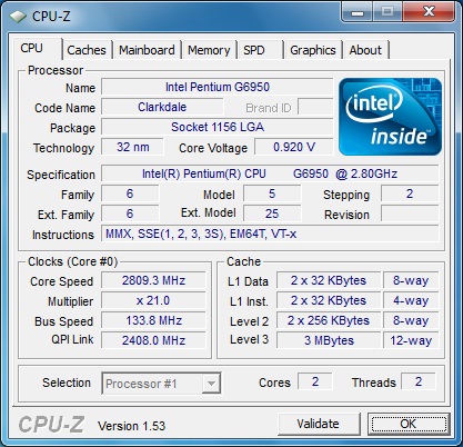 Процессор Pentium G6950 имеет два физических ядра и работает на частоте 2,8 ГГц, а технология HyperTreading не поддерживается. Благодаря этому процессор потребляет меньше энергии и его тепловой режим более благоприятен для компактных систем. Так как Pentium G6950 имеет довольно высокий множитель (21), можно предположить, что его разгон не потребует серьезных усилий со стороны оверклокера. Так, собственно, и получилось.