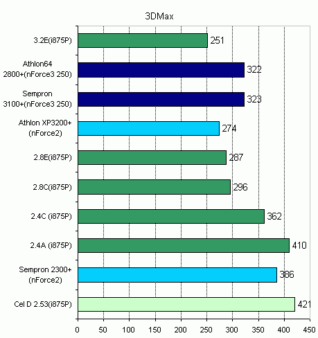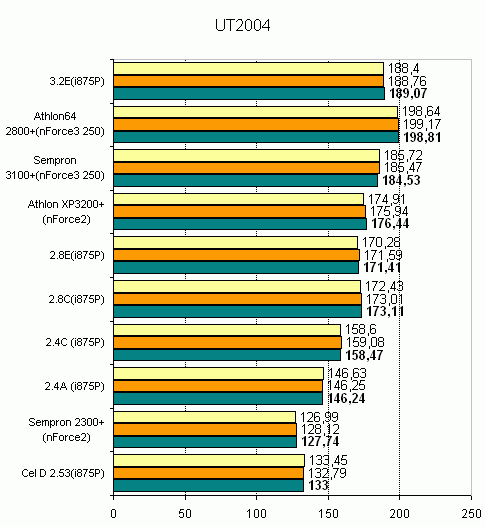 Однако, если у пользователя чуть больше денег в кармане, то выбор процессора расширяется за счет моделей Sempron 3100+ (Socket754) и Pentium4 2.4A (оба стоят порядка 125$). И если сравнить производительность разогнанных процессоров, то лучшие результаты принадлежат процессору AMD. И это при том, что система Socket754 работала в асинхронном режиме (который отнимает значительную долю производительности).