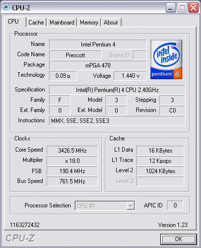 Следующий процессор - Pentium4 2.4A стабильно заработал на частоте FSB = 190Мгерц, а его тактовая частота составила 3.4 Ггерц.