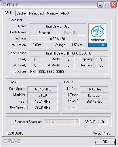 Теперь пара слов о разгоне процессоров Intel. Первый процессор - Celeron D 325 был разогнан со штатной частоты FSB 133Мгерц до частоты 190Мгерц. В результате его тактовая частота составила 3.7 Ггерц, что довольно неплохой результат.