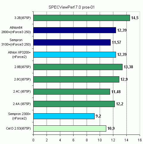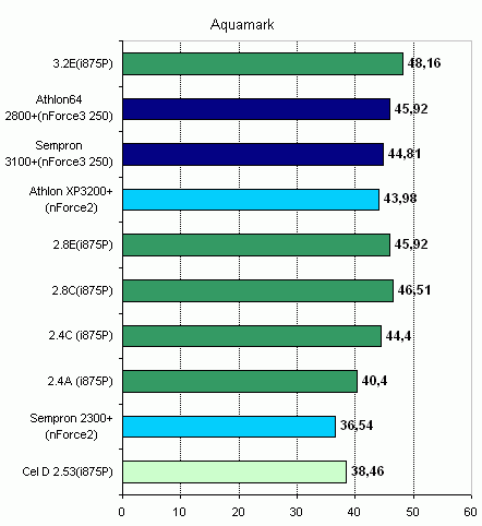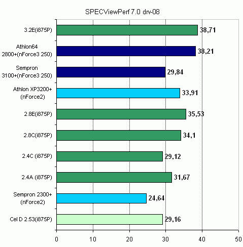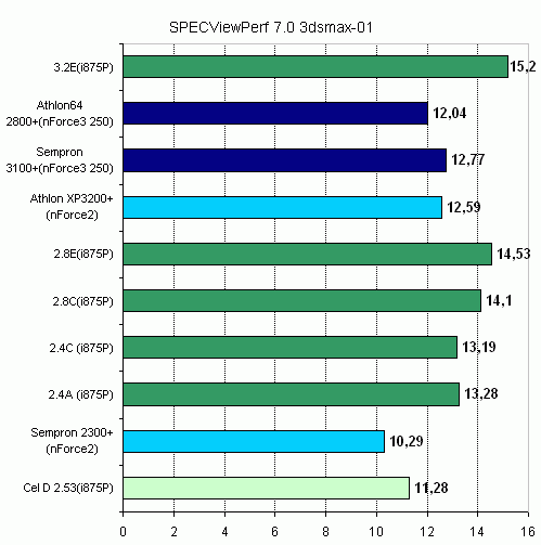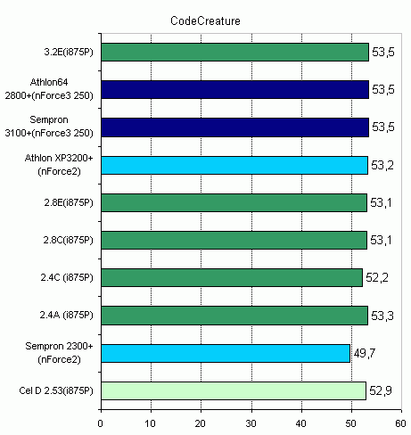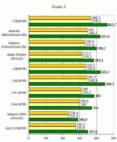 При рассмотрении результатов в игре Id Quake3 нужно помнить, что производительность этого приложения очень сильно зависит от пропускной способности подсистемы памяти. Появление встроенного контроллера памяти в процессоре Athlon64Sempron S754, позволило последнему серьезно увеличить производительность в этом тесте (напомню, что на движке Quake3 выпущено большое количество игр начиная от Return to Castle Wolfenstein и заканчивая Call of Duty).