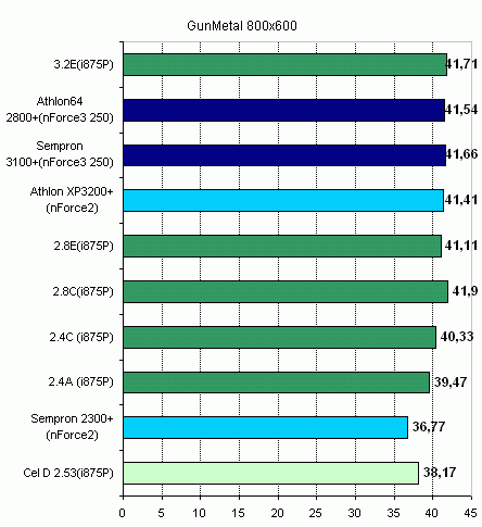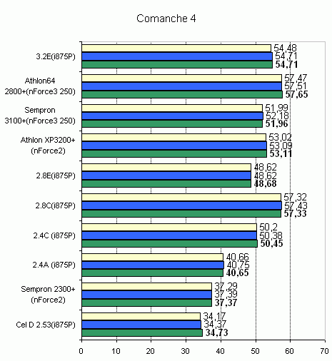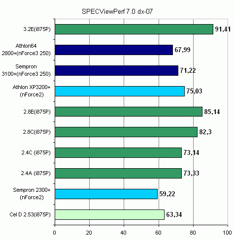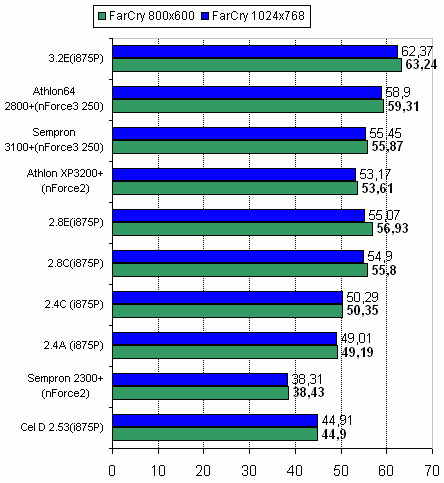 В остальных играх ситуация не меняется - процессоры Athlon64Sempron S754 показывают очень высокие результаты. Что касается Sempron SocketA, то он показывает скорость аналогичную процессорам Celeron-D.