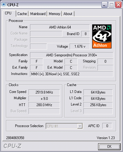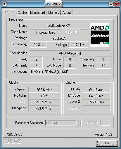 Версия 1.23 не умеет определять принадлежность процессора к семейству Sempron SocketA. Зато верно показывает, что процессор Sempron 2300+ основан на ядре Thoroughbred-B, а также все остальные характеристики.