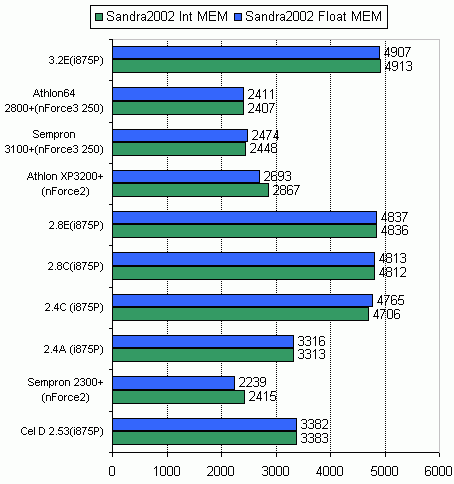 Перед нами исключительно синтетические приложения, которые демонстрируют теоретическую производительность. Особо показателен результат теста Sandra 2002: старая версия программы "не узнает" систему Athlon64Sempron S754, и вычисляет пропускную способность памяти совершенно непонятным образом.