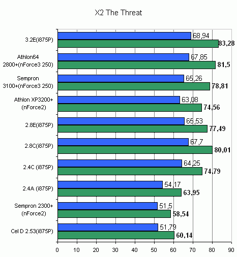 В игре Serious Sam процессоры AMD всегда показывали отличные результаты, обгоняя многие процессоры Intel. С выходом Athlon64 преимущество продуктов AMD только увеличилось. Дело в том, что производительность в этой игре довольно сильно зависит от длины конвейера(особо показательна разница между 2.8E (ядро Prescott) и 2.8С (ядро Northwood)). Как следствие процессоры Pentium4, даже с частотами 3.2Ггерц и выше, выглядят слабо.