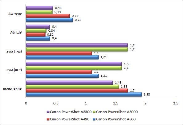 Canon PowerShot A800 впечатляет заявленными характеристиками автономной работы. При тестировании по методике CIPA заряда хватает на 300 снимков (с щелочными источниками, входящими в комплект), 500 снимков (с приобретаемыми дополнительно аккумуляторами Canon NB-3AH), тогда как предшественница могла продержаться с теми же источниками 150 и 400 снимков соответственно. Заявленный прирост весьма солидный, но практике двукратного роста длительности автономной работы нет — на комплектных источниках камера продержалась 285 кадров, тогда как предшественница — 206. При этом с отображением приблизительного уровня оставшегося заряда у A800 беда, ведь как такового индикатора нет, и камера сообщает лишь о критически низком уровне заряда.