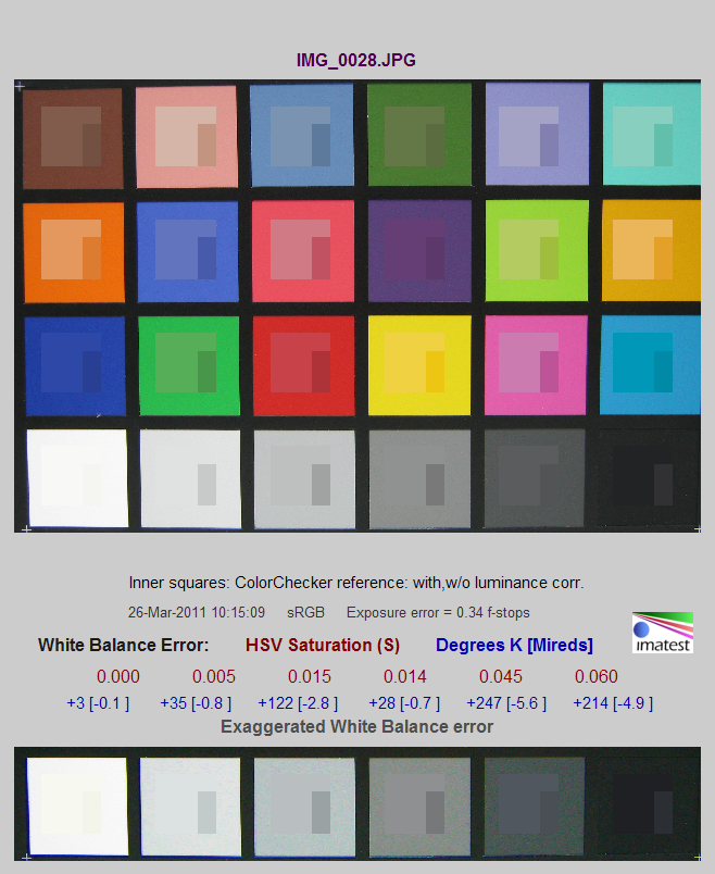Также с разными значениями чувствительности была отснята тестовая таблица Munsell ColorChecker. Кроп-фрагменты создавались в программе Photoshop CS5, с последующим сохранением в формате JPEG с минимальным коэффициентом сжатия. На снимке, приведённом ниже, зелёными квадратами обозначены области кроп-фрагментов.