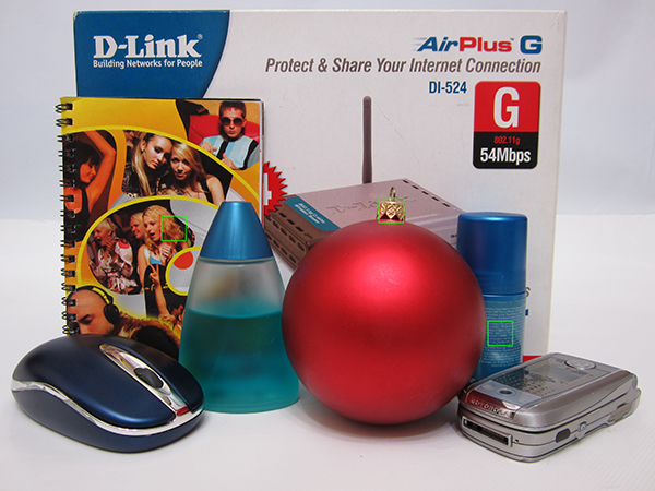 Для оценки шумности использовался следующий метод: фотографировалась группа разноцветных объектов со всеми значениями чувствительности в формате JPEG, баланс белого был выставлен по белому листу. Кроп-фрагменты создавались в программе Photoshop CS5, с последующим сохранением в формате JPEG с минимальным коэффициентом сжатия. На снимке, приведенном ниже, зелеными квадратами обозначены области кроп-фрагментов. Тестовые кадры были отсняты с чувствительностью от 80 до 1600 единиц. В качестве оппонентов были выбраны следующие фотоаппараты: Canon PowerShot A800, Olympus FE-5050 и Nikon Coolpix S5100.