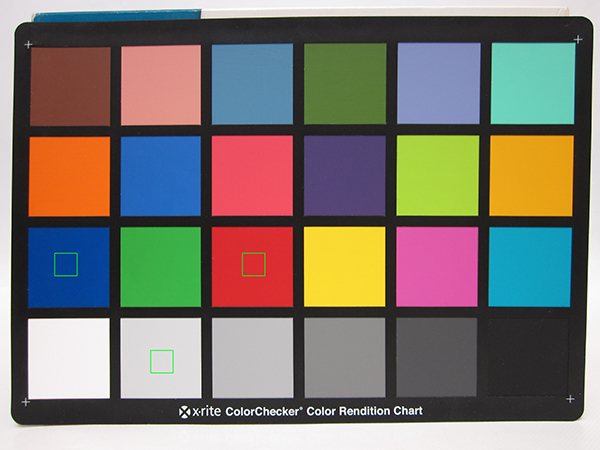 Также с разными значениями чувствительности была сфотографирована тестовая таблица Munsell ColorChecker. На снимке, приведённом ниже, зелёными квадратами обозначены области кроп-фрагментов
