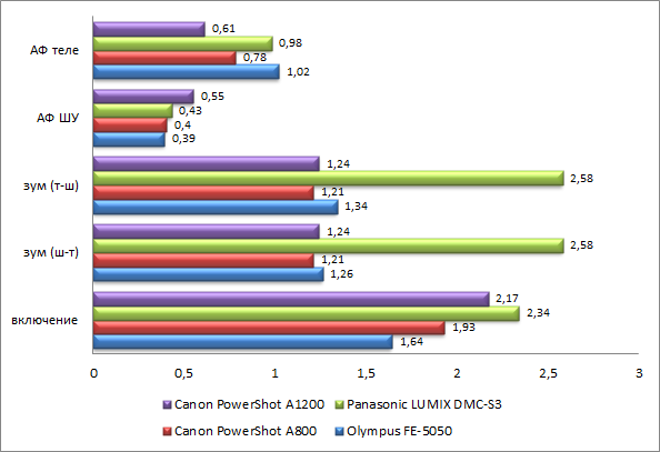По скорости включения и подготовки к съёмке камера лишь немного не вписывается в двухсекундный норматив — 2,17 секунды. Трансфокатор от края к краю перемещается довольно быстро — 1,24 секунды, причём независимо от направления перемещения. Замер скорости фокусировки проводился при освещении флуоресцентными осветителями, в качестве объекта наведения использовался тестовый натюрморт, применяемый при оценке уровня шумов, фокусировка производилась по центральной зоне, перед каждым замером камера наводилась на бесконечность. Замер был произведён в ШУ-положении объектива с расстояния до объекта съёмки в 30 см и со 100 см в телеположении объектива. Результаты оказались близкими — 0,55 секунды в ШУ-положении и 0,57 секунды в телеположении.