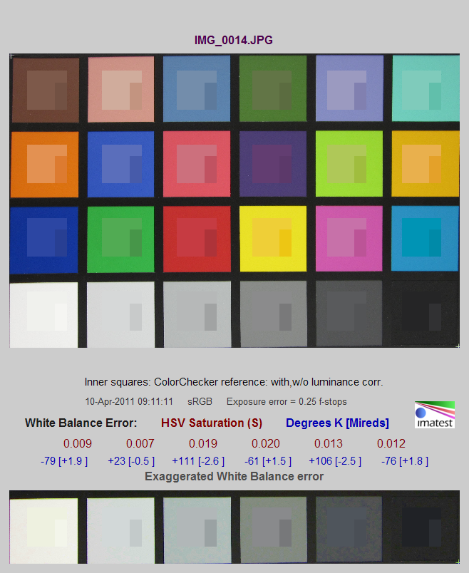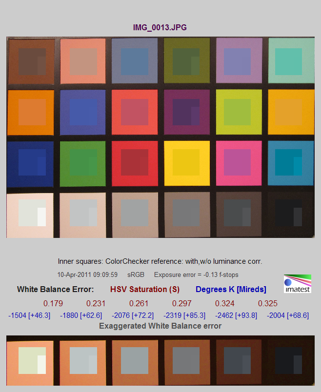 На изображениях в каждом поле малый внутренний прямоугольник является эталонным цветом, а внутренний квадрат — полученным камерой, но приведённым по яркости и контрасту, внешний квадрат — необработанная область, полученная с камеры. Красные числа обозначают отклонения цвета по шкале S в цветовом пространстве HSV, а синие — в градусах Кельвина [Мередах].