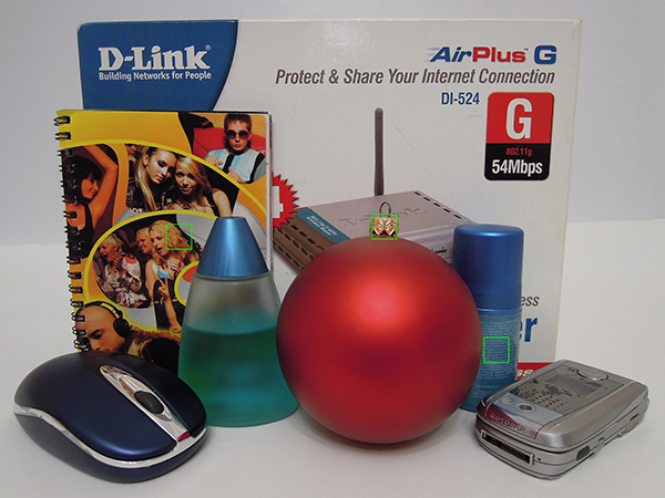 Для оценки шумности использовался следующий метод: фотографировалась группа разноцветных объектов со значениями чувствительности от 160 до 3200 единиц в ISO-эквиваленте. Баланс белого устанавливался по белому листу. Кроп-фрагменты создавались в программе Photoshop CS5, с последующим сохранением в формате JPEG с минимальным коэффициентом сжатия. На снимке, приведённом ниже, зелёными квадратами обозначены области кроп-фрагментов. В качестве оппонентов были выбраны следующие камеры: