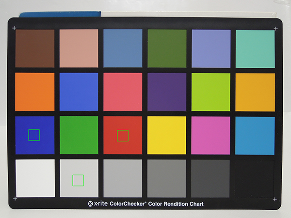 Также с чувствительностью от 100 до 3200 единиц была сфотографирована тестовая таблица Munsell ColorChecker. На снимке, приведённом ниже, зелёными квадратами обозначены области кроп-фрагментов.