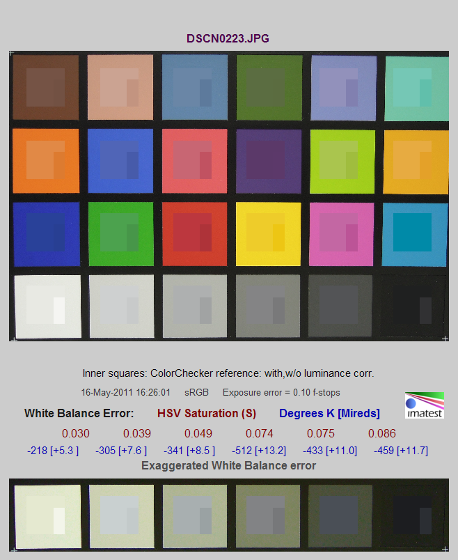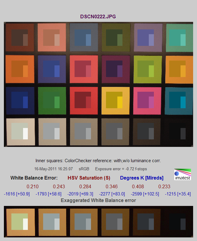 На изображениях в каждом поле малый внутренний прямоугольник является эталонным цветом, а внутренний квадрат — полученным камерой, но приведённым по яркости и контрасту, внешний квадрат — необработанная область, полученная с камеры. Красные числа обозначают отклонения цвета по шкале S в цветовом пространстве HSV, а синие — в градусах Кельвина [Мередах].