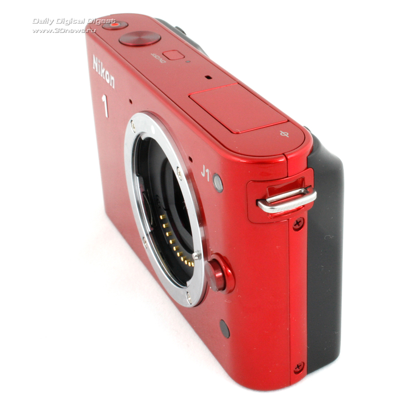 Небольшого выступа в левой части лицевой панели, как у V1, у тестируемой камеры нет, так что ее менее удобно держать одной рукой. К тому же лакокрасочное покрытие корпуса зеркально гладкое, поэтому камера здорово скользит в руках, особенно в хоть чуть-чуть влажных. В общем, без наплечного ремешка работать с камерой даже немного страшновато — всё же не компакт за 100 долларов. Тут же стоит отметить ещё один небольшой недостаток: крепежи ремешка не вращаются. А вот к качеству сборки замечаний нет — всё безупречно. При попытках сдавливания и скручивания корпус совершенно не поддаётся и не издаёт никаких звуков.