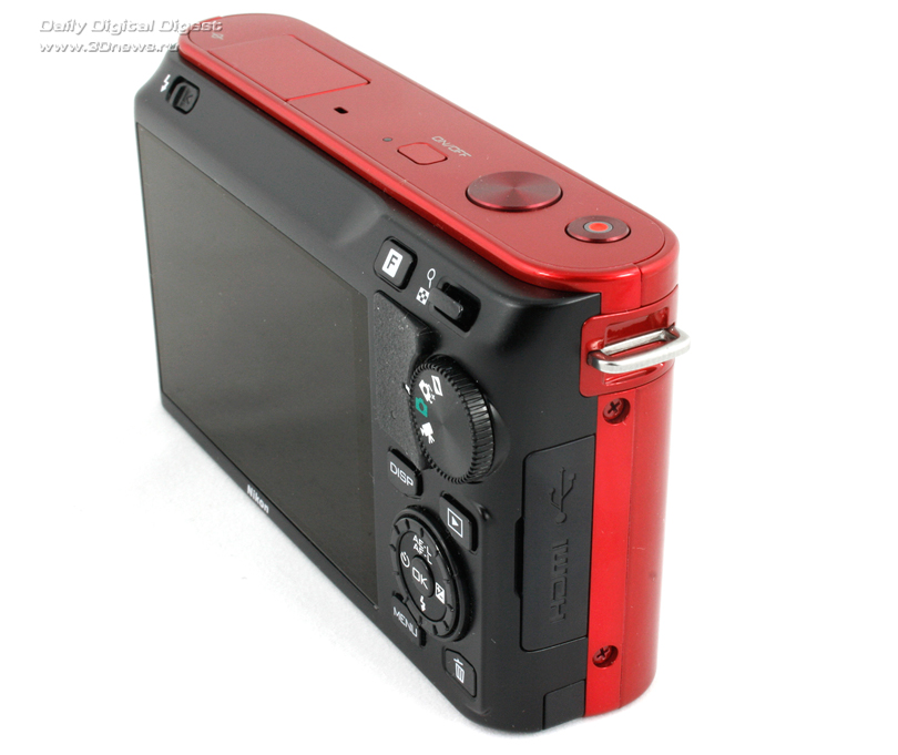 Тыльная сторона почти такая же, как у недавно рассмотренной V1. Отличие лишь одно — на круглой многофункциональной клавише кнопка «вниз» отвечает за вызов меню выбора режима работы вспышки, тогда как у V1 — за меню выбора режима фокусировки. Итак, большую часть поверхности занимает экран, над которым находится ползунок механического замка вспышки, а правее — функциональная клавиша, рычажок масштабирования изображения при просмотре, который также используется для управления длительностью выдержки и раскрытием диафрагмы. Ниже располагается диск выбора режимов съёмки, клавиша перехода в режим просмотра и кнопка выбора режима отображения, круглая многофункциональная клавиша с кнопкой ввода по центру и вращающимся кольцом по периметру. Еще ниже — клавиши входа в основное меню и удаления.
