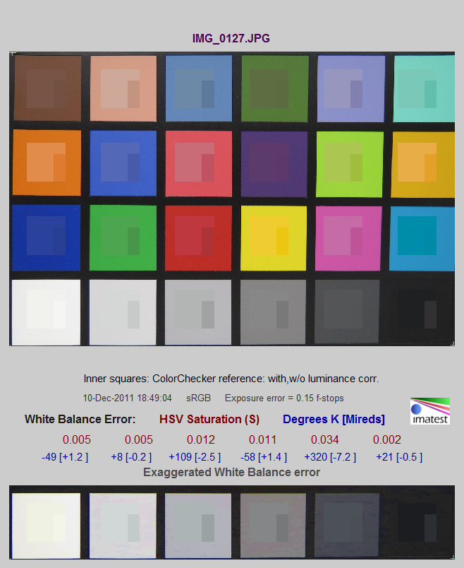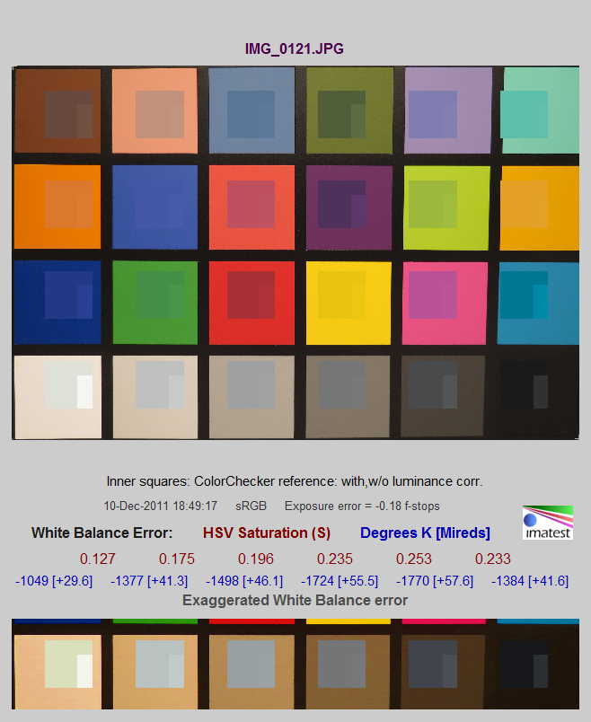 На изображениях в каждом поле малый внутренний прямоугольник является эталонным цветом, а внутренний квадрат — полученным камерой, но приведённым по яркости и контрасту, внешний квадрат — необработанная область, полученная с камеры. Красные числа обозначают отклонения цвета по шкале S в цветовом пространстве HSV, а синие — в градусах Кельвина [Мередах].