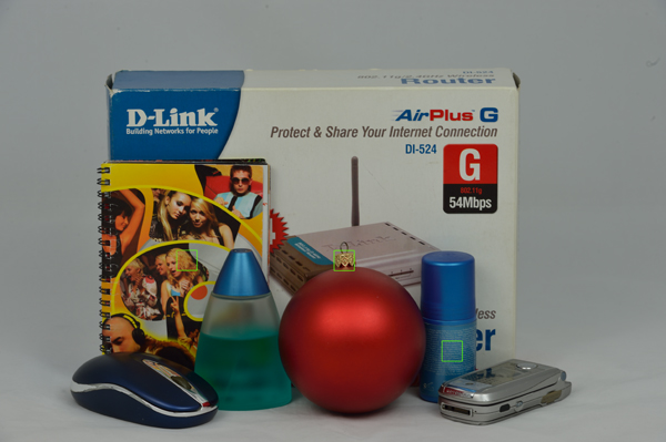 Для оценки шумности использовался следующий метод: фотографировалась группа разноцветных объектов со всеми значениями чувствительности в формате RAW (NEF) с последующим преобразованием в программе Nikon ViewNX в формат TIFF без сжатия, баланс белого был выставлен автоматически. Съёмка тестовой мишени также была проведена в формате JPEG при отключенном и активированном режиме шумоподавления (отдельно для всех уровней активности). Режим подавления шумов на длинных выдержках не использовался из-за того, что автоматика активирует его только при длительности выдержки более 8 секунд. Кроп-фрагменты создавались в программе Photoshop CS5, с последующим сохранением в формате JPEG с минимальным коэффициентом сжатия. На снимке, приведенном ниже, зелеными квадратами обозначены области кроп-фрагментов. Тестовые кадры были отсняты со всеми доступными значениями чувствительности с шагом 1 EV от 50 до 204 800 единиц.