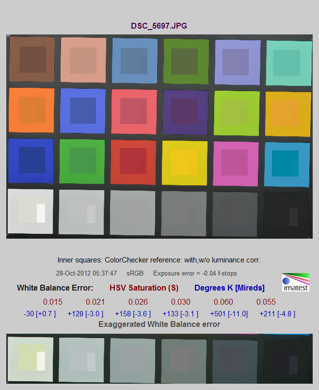 Для оценки корректности автоматического определения баланса белого использовалась таблица Colorchecker 24. Выбранные источники постоянного света — флуоресцентные лампы с цветовой температурой 5500 K, а также осветители с лампами накаливания. Результаты тестирования приведены ниже.