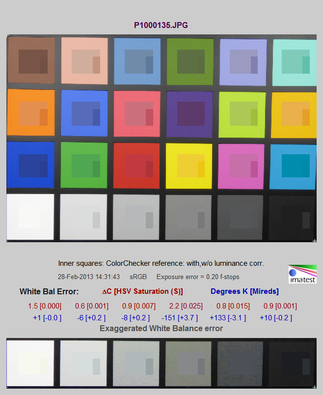 Для оценки корректности автоматического определения баланса белого использовалась таблица Colorchecker 24. Выбранные источники постоянного света — флуоресцентные лампы с цветовой температурой 5500 K, а также осветители с лампами накаливания. Результаты тестирования приведены ниже.