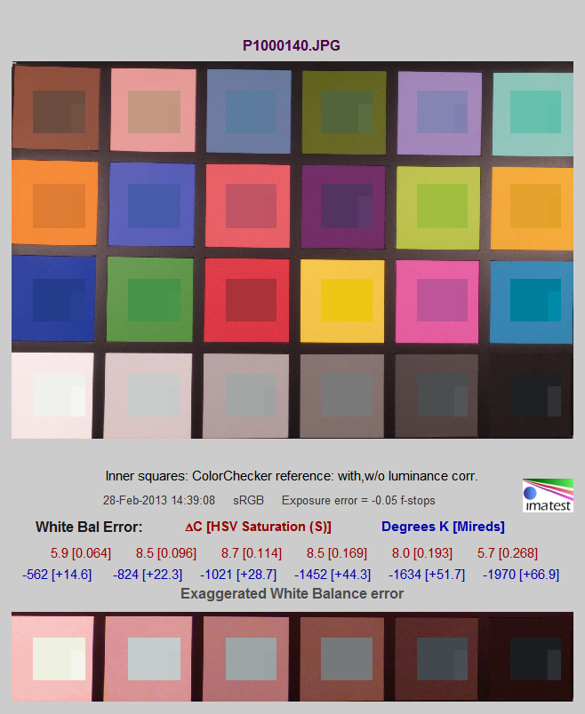 На изображениях в каждом поле малый внутренний прямоугольник является эталонным цветом, а внутренний квадрат — полученным камерой, но приведённым по яркости и контрасту, внешний квадрат — необработанная область, полученная с камеры. Красные числа обозначают отклонения цвета по шкале S в цветовом пространстве HSV, а синие — в градусах Кельвина [Мередах].