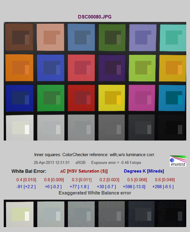 Для оценки корректности автоматического определения баланса белого использовалась таблица Colorchecker 24. Выбранные источники постоянного света — флуоресцентные лампы с цветовой температурой 5 500 K, а также осветители с лампами накаливания. Результаты тестирования приведены ниже.
