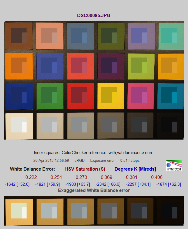 На изображениях в каждом поле малый внутренний прямоугольник является эталонным цветом, а внутренний квадрат — полученным камерой, но приведённым по яркости и контрасту, внешний квадрат — необработанная область, полученная с камеры. Красные числа обозначают отклонения цвета по шкале S в цветовом пространстве HSV, а синие — в градусах Кельвина [Мередах].