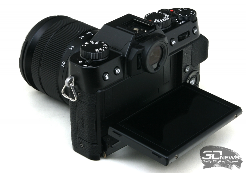 OLED-видоискатель обладает внушительным разрешением в 2 360 тыс. точек. Точно такое же разрешение у видоискателей фотоаппаратов Panasonic DMC-G7 и Olympus OM-D E-M5, а вот у Sony ILCE-α6000 меньше – 1 440 тыс. точек. Впрочем, тут стоит сделать оговорку: у X-T10 размер матрицы значительно меньше, чем в случае видоискателя Fujifilm X-T1, который обладает тем же разрешением, – 0,39 против 0,5 дюйма. Несмотря на это, видоискатель чрезвычайно удобен в работе. Да, это не гибридный видоискатель, тем не менее перед конкурентами он не пасует. А вот к чему можно придраться, так это к небольшому и твёрдому наглазнику — тут T10 уступает всем конкурентам, включая Sony ILCE-6000.