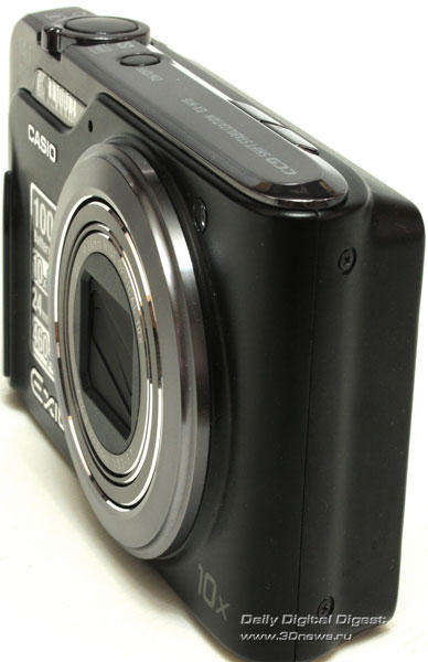 В плане дизайна и расположения органов управления тестируемый аппарат напоминает камеру Casio FH100, которая совсем недавно побывала у нас на тестировании, фактически, уже с нескольких метров их вполне можно перепутать. Сходство у этих камер есть не только снаружи, но и внутри, ведь и H15 и FH100 оборудованы совершенно одинаковыми объективами с 10-кратной оптической трансфокацией (24-240 мм в 35-мм эквиваленте). Однако элементов контроля в тестируемой камере значительно меньше – нет рычажка выбора скорости видеозаписи и клавиши скоростной съёмки, да и диск выбора режимов отсутствует.