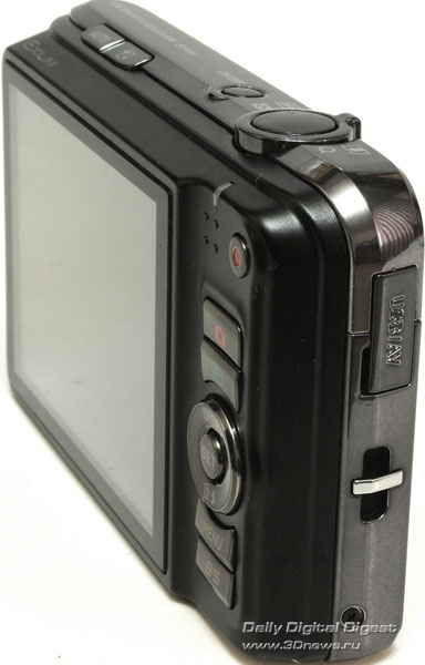 В отличие от более дорогого фотоаппарата FH100, тестируемая камера оборудована дисплеем с вдвое большим разрешением - 460 тыс. точек, о чём сообщает наклейка на корпусе. Было бы чем гордиться: ведь данную планку берут уже даже откровенно бюджетные камеры с меньшей диагональю, тогда как у тестируемой камеры довольно большой дисплей с диагональю 3 дюйма. Углы обзора и цветопередача дисплея радуют, да и максимальная яркость довольно высока, но, несмотря на это, на солнце дисплей слепнет, хотя работать с камерой можно даже при прямой солнечной засветке, однако оценить полученные снимки в таких условиях нельзя. Защита дисплея тонкая и установлена слишком близко к ЖК-матрице, поэтому при давлении на неё легко прогибается вплоть до соприкосновения. Конечно, никаких защитных функций не заявлено, но наиболее хрупкую деталь камеры можно было бы защитить и получше.