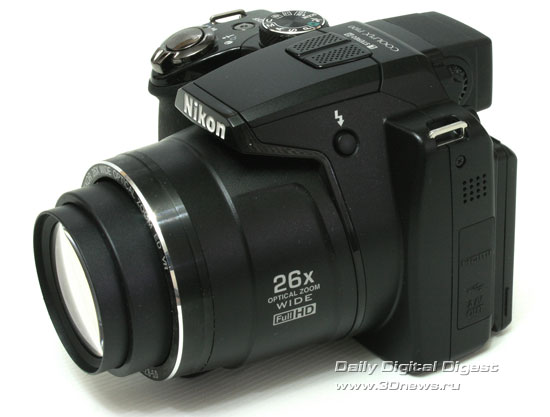 При внешнем осмотре какие-либо отличия дисплея тестируемой камеры от дисплея P90 обнаружить сложно, точнее, вовсе невозможно - такая же диагональ и аналогичный поворотный механизм. А вот во время работы с камерой отличия заметны сразу же - разрешение стало в два раза выше, 460 тыс. точек против 230 тыс. у P90. Кроме того, улучшена цветопередача, углы обзора стали больше, яркость осталась на прежнем уровне, но теперь при попадании прямых солнечных лучей дисплей не слепнет так сильно, как у предшественницы, и в таких условиях можно комфортно работать, не прибегая к помощи видоискателя.