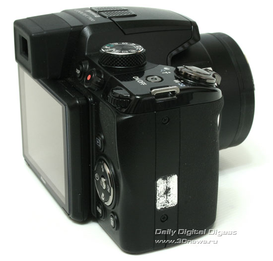 Сверху находится видоискатель, снабженный регулятором диоптрий и твердым не слишком удобным наглазником. Здесь же находится клавиша переключения между дисплеем и видоискателем, клавиша смены режима отображения дисплея, а также клавиша начала видеосъемки, окруженная рычажком выбора разрешения видеозаписи.