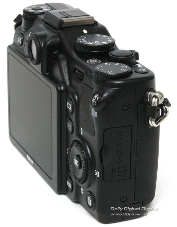 Сзади, кроме большого 3-дюймового экрана, расположено довольно много органов управления. Над дисплеем находятся видоискатель с небольшим круглым, но не самым удобным наглазником с регулятором диоптрий, а также клавиша выброса встроенной вспышки. Правее дисплея расположились диск изменения параметров, клавиша блокировки экспозиции и фокусировки, клавиша смены режима отображения и она же - клавиша отключения дисплея, круглый многофункциональный джойстик с клавишей ввода по центру и вращающимся ободком, который используется не только для быстрой навигации в меню, но и для управления диафрагмой. Тут же находится тыльный ИК-приёмник, клавиша входа в основное меню и клавиша удаления снимков.