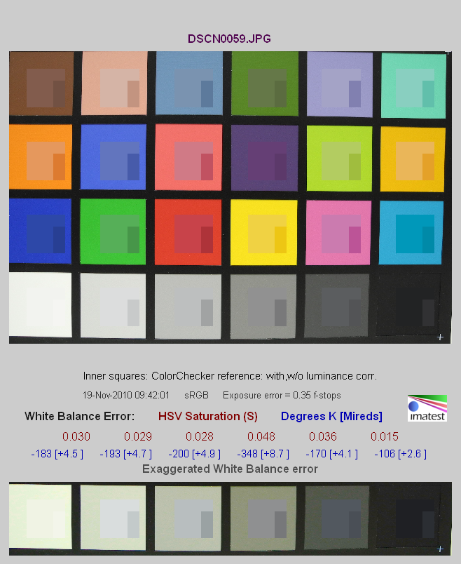Настройки баланса белого стандартны для компактных камер Nikon - предусмотрено семь пресетов (дневной, лампа накаливания, три варианта ламп дневного света, облачно, вспышка), а также автоматический и ручной режим определения, к тому же для ручных установок предусмотрено три контейнера. Также предусмотрена ручная установка цветовой температуры в диапазоне 2500-1000 Кельвин с логарифмической шкалой изменения. Любую из настроек можно подстроить по осям A-B/G-M (по 6 значений на каждой оси). Кроме того, предусмотрен автоматический брекетинг по балансу белого. Настройки данной функции аналогичны настройкам автоматического брекетинга по экспозиции. Но всем этим впечатляющим арсеналом пользоваться приходится нечасто, ведь даже при освещении флуоресцентными лампами с цветовой температурой 6400 К ошибки как для компакта довольно малы. Для оценки корректности автоматического определения баланса белого использовалась таблица Colorchecker 24. Используемые осветители постоянного света - флуоресцентные лампы с цветовой температурой 6400К. Результаты тестирование приведены ниже.