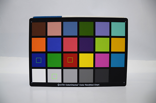 Также вне зачёта с теми же уровнями чувствительности была отснята тестовая таблица Munsell ColorChecker. Съёмка производилась в формате JPEG с отключенным шумоподавлением. На снимке, приведённом ниже, зелёными квадратами обозначены области кроп-фрагментов.