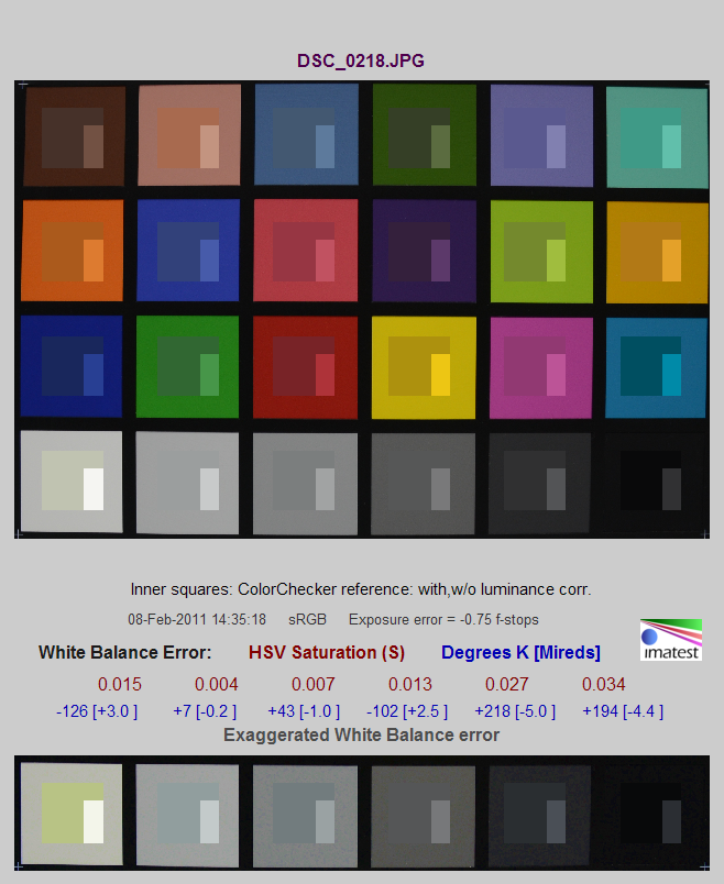 Настройки баланса белого, кроме автоматического, включают шесть стандартных пресетов: дневной свет, лампы накаливания, лампы дневного света, облачно, вспышка, тень, причём все предварительные настройки можно корректировать по осям A-B/G-M (по 6 значений на каждой оси). Пресет ламп дневного света и вовсе делится на 7 подтипов, которые также отдельно корректируются по осям A-B/G-M. Имеется и ручной режим установки по карте белого или серого, причём доступно сразу 5 контейнеров, каждому из которых можно присвоить произвольное имя. Для оценки корректности автоматического определения баланса белого фотографировалась таблица Colorchecker 24. Используемые осветители постоянного света — флуоресцентные лампы с цветовой температурой 6400К, а также осветители с лампами накаливания. Результаты тестирования приведены ниже. Как видно на иллюстрациях, при освещении лампами дневного света ошибка невелика, но в случае использования галогеновых источников она возрастает до неприличных значений.