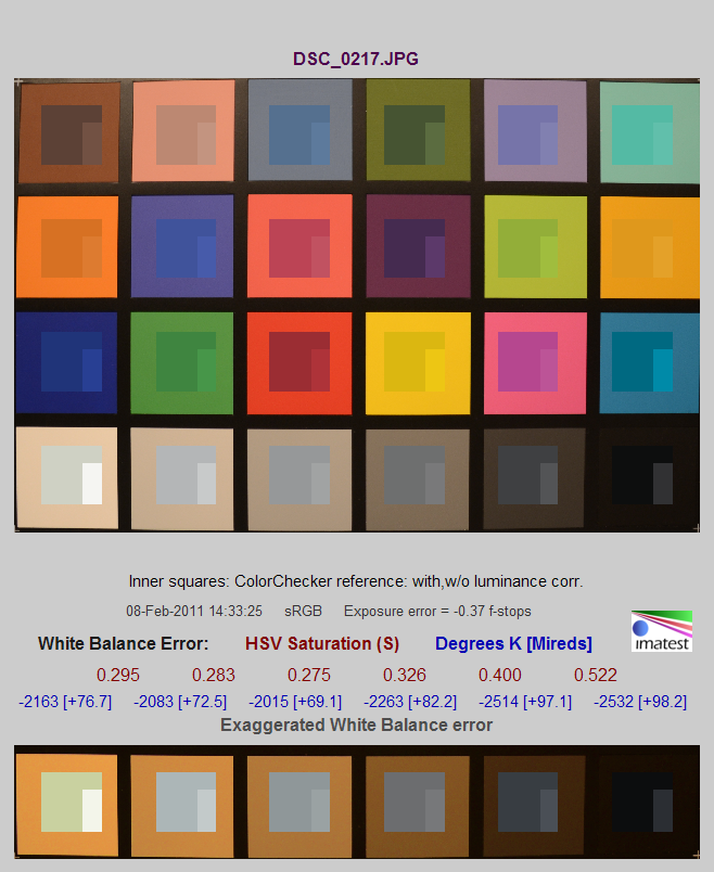 На изображениях в каждом поле малый внутренний прямоугольник является эталонным цветом, а внутренний квадрат — полученным камерой, но приведённым по яркости и контрасту, внешний квадрат — необработанная область, полученная с камеры. Красные числа обозначают отклонения цвета по шкале S в цветовом пространстве HSV, а синие — в градусах Кельвина [Мередах].