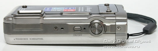 Лицевая панель практически не изменилась - тут находится лампа подсветки при видеосъемке, окошко вспышки и объектив, скрытый металлической шторкой. Как и в более ранних защищенных камерах 6000/8000 серии, у тестируемой камеры наблюдается та же проблема с защитной шторкой - после съемки в воде капли остаются под шторкой и не высыхают, поэтому при последующем использовании камеры на суше могут возникнуть проблемы. Конечно, можно перед выключением камеры высушить капли под солнцем, но все же это определенное неудобство, однако такова плата за наличие защиты объектива.
