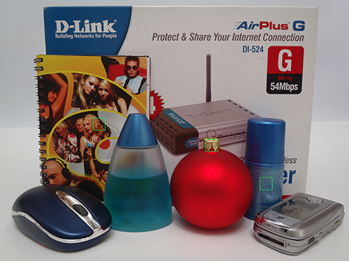 Для оценки шумности использовался следующий метод: фотографировалась группа разноцветных объектов со всеми значениями чувствительности в формате JPEG, баланс белого в камере Panasonic был выставлен по белому листу, а в Olympus - автоматически. Кроп-фрагменты создавались в программе Photoshop CS2, с последующим сохранением в формате JPEG с минимальным коэффициентом сжатия. На снимке, приведенном ниже, зелеными квадратами обозначены области кроп-фрагментов. В качестве оппонентов были выбраны 10-Мп Olympus μ TOUGH-6000 и 12-Мп камера Panasonic LUMIX DMC-FT1. Все участники используют матрицу 1/2,33 дюйма.