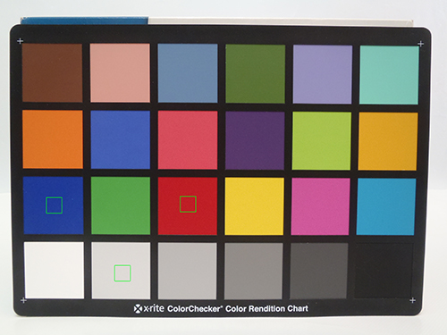 Также со всеми доступными значениями чувствительности была сфотографирована тестовая таблица Munsell ColorChecker. Кроп-фрагменты создавались в программе Photoshop CS2, с последующим сохранением в формате JPEG с минимальным коэффициентом сжатия. На снимке, приведенном ниже, зелеными квадратами обозначены области кроп-фрагментов.
